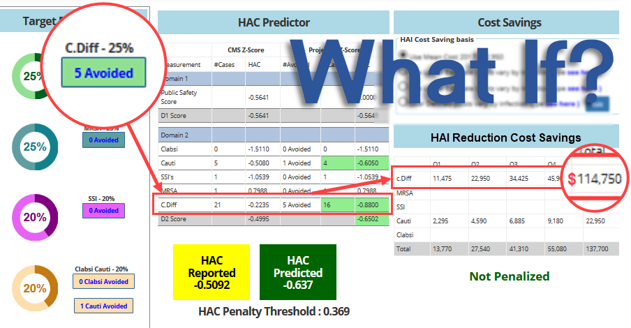Set your own specific thresholds for HAI rates, quality inspections and more and quickly spot issues with color-coded warnings. Compare your facility to system level performance. Calculate your savings by using HAIvia’ s infection reduction ROI cost savings calculator. |